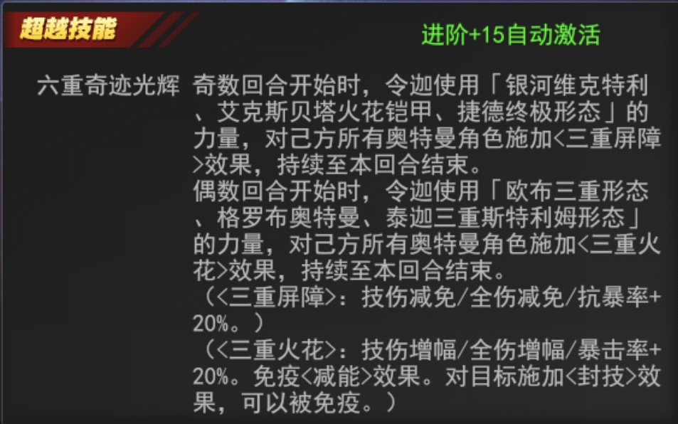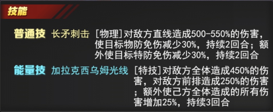 能量技:加拉克西乌姆光线 <特技> 对敌方全体造成450%的伤害,对敌方前排造成250%的伤害;
